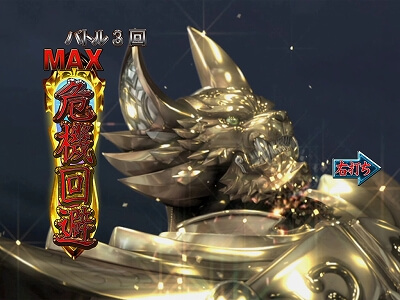 15R or 4R大当りとなっており、15Rならば魔戒チャンス継続が濃厚。一方、4R大当りとなると魔戒チャンス継続をかけた危機回避演出が発生する。