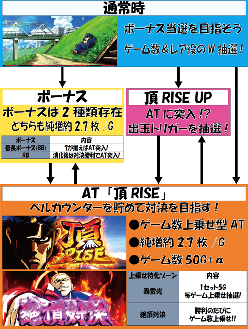 通常時はゲーム数&レア役のW抽選でボーナスまたはAT「頂RISE」突入を目指す。
