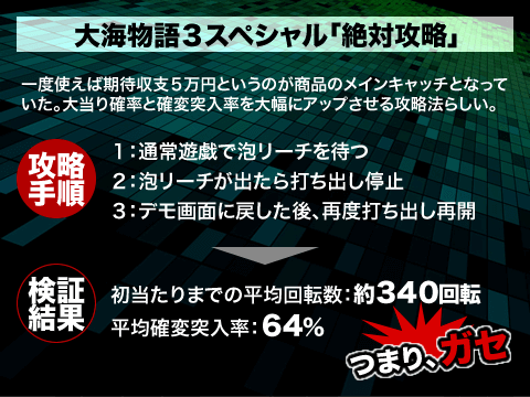 いずれも詳しい内容は書かれていなかったが、要するに大当り確率や確変突入率を上げるスペックアップ系攻略のジャンルに属するらしい。