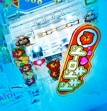 全三機種が発売されている「南国育ち」のシリーズ最新台、従来は平和名義で発売されていましたが、今作南国育ち羽根はアムテックス社よりリリース。一種二種混合スペックを採用し、液晶大当たりルートと自力V入賞「キュインチャレンジ」の二種類を楽しめる機械となりました。