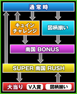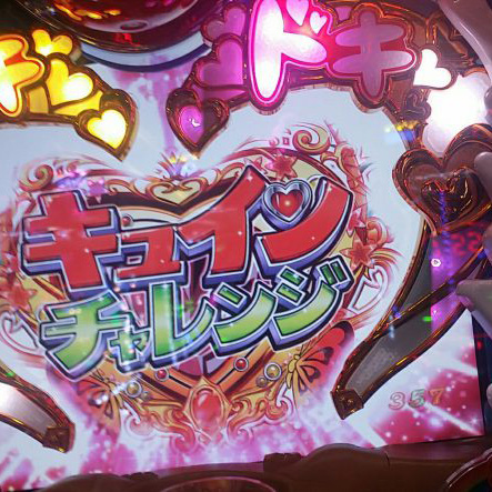電サポ中は1/319.6の図柄揃い大当りとキュインチャレンジ(発生確率1/18.9)にて連チャンを狙う。理論上ながら時短中は、2~3回程度キュインチャレンジが発生する可能性があるのでワンチャンをものにしたい。