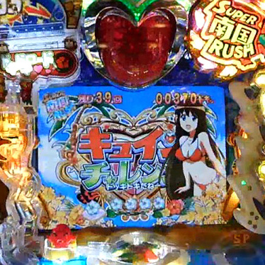 南国育ち羽根の大当たり後に突入する「SUPER南国RUSH」は電チューサポート50回転の左打ち仕様。消化中は1/319.6の液晶大当たり、若しくは1/18.9(特図2)で発生する「キュインチャレンジ」経由のV直撃大当たりを目指します。なお、RUSH中大当たりは15R比率が高く設定されていて、ここに攻略効果を高められる秘訣があります。