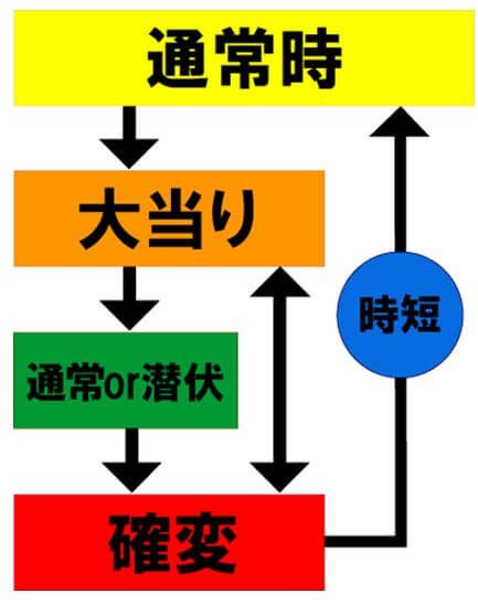 成功すると絵柄揃いの大当りとなるが、失敗するとモード移行が発生。通常だった場合は小当りとなり、出玉ナシ確変となった場合は潜伏状態に突入。なお、ヘソ当選時のみ突入する。