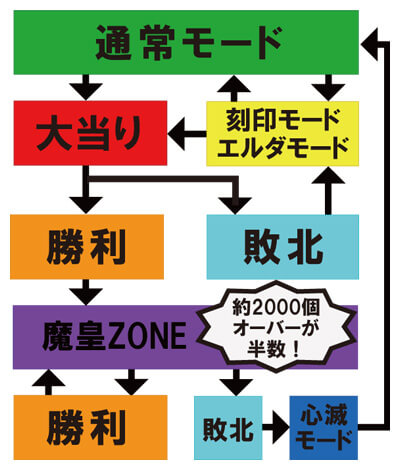 見事勝利すれば、魔皇ゾーンへと移行。敗北してしまうと、刻印モードもしくはエルダモードと呼ばれる潜伏or通常の特殊モードへと移行。たとえ潜伏中だとしても、モード抜けをしてしまう事は大いにあり得るので、安易にモードを抜けたからといってヤメてしまわないように。