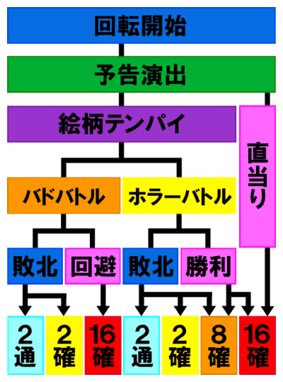 前者の場合は2R系or16R確変とハイリスクハイリターン。後者で勝利した場合のみ8R確変も追加する。