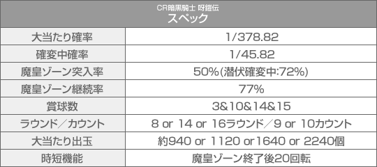 なお電サポが作動する魔皇ゾーンへと移行すれば、確変継続率77%、16R確変(出玉約2200個)が51%の割合でループする事になるので、一気に大量出玉を得ることも出来るぞ。