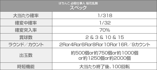 ぱちんこ 必殺仕事人 桜花乱舞 パチンコ機種 メーカー 京楽産業 導入日 2012-11-19 パチンコ・パチスロホルコンプログラム完全撃破-ホルコンプログラム撃破打法- 京楽産業より必殺仕事人シリーズ最新作『ぱちんこ 必殺仕事人 桜花乱舞』が登場。本機種は初のバトルタイプ。大当たり確率は約1/318、確変突入率70%。そしてボーナス中の出玉数は約2000個を誇る。大当たり後の時短は100回転あるので出玉感はかなりのもの。右打ちで消化する「乱舞モード」は、仕事人を狙う刺客が次々と現れ、襲撃を回避しながらバトルに勝てば、出玉がどんどん増える。「乱舞ラッシュ」中は、盤面を覆う大迫力の「桜花フラッシュ」が炸裂すれば、約2000個もの出玉のスーパー乱舞ボーナスとなり、至福の時が訪れる。通常時は、お馴染み「豪剣フラッシュ」が発動し、「主水SPリーチ」または七図柄限定の「主水必殺リーチ」になれば激アツ。そして、いきなり豪剣スパーク発動で、衝撃の「全回転リーチ」というスペシャルサプライズも搭載している。 メルマガ登録でパチンコで安定して稼ぎ続ける「4つの裏技」プレゼント 実はパチンコで勝つことはとてもカンタン!実はパチンコで大儲けすることはとてもカンタンなのです!それじゃ、なんで自分はパチンコで勝てないんだって? それはアナタがパチンコ店の収益システムに組み込まれてしまっているから・・・ だけど大丈夫です!セブンあたるがアナタにパチンコで稼ぐ方法を教えます! 4つの裏技がもらえる! メルマガ登録はこちら パチンコ・パチスロホルコンプログラム完全撃破-ホルコンプログラム撃破打法-