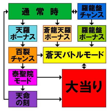 潜伏確変となるのは、泰聖院モード終了後に移行する「天命の刻」のみなので即ヤメ厳禁。なお、天命の刻中に大当りを引ければ蒼天バトルモードへと突入する。