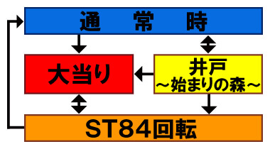 絵柄揃い大当り時はそのままST84回転へと突入。また井戸〜始まりの森〜に移行すると小当りor潜伏確変当選となる。ラウンドランプにて判別も可能。見逃した場合はしばらく様子見し、呪縛ゾーンへと突入すれば潜伏濃厚だ。なお、潜伏は初回のみとなっており、再度出玉ナシ確変に当選した場合は電サポが作動する。
