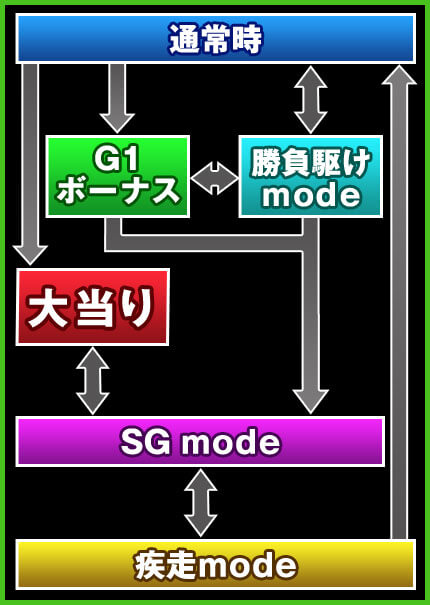 潜伏確変を搭載しており、こちらは出玉を得られるGIボーナスのみがループする可能性がある。小当りor潜伏確変となるモード移行に関しては初回のみが潜伏となっている。