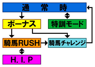 チャレンジボーナスは、演出に成功すれば騎馬RUSH(確変)へ、失敗で騎馬チャレンジ(確変or時短)へと移行する。騎馬チャレンジの内部状態が確変だった場合は必ず騎馬RUSHへと昇格する。