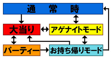 BIG、REGの2種類があり、いずれもその後の演出に成功するとPARTY突入、失敗するとアゲナイトモードへ移行する。