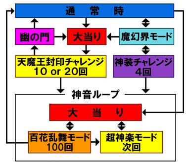 複雑なフローだが、超神楽モード、百花乱舞モードで大当りを連チャンさせる「神音ループ」にいかに入れるかが鍵となる。