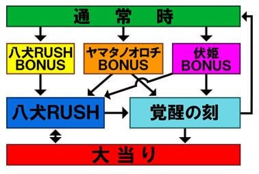 オロチバトル敗北時に突入することがある大当りで、八犬士復活演出にチャレンジ。成功すれば八犬RUSH、失敗で覚醒の刻へ移行する。