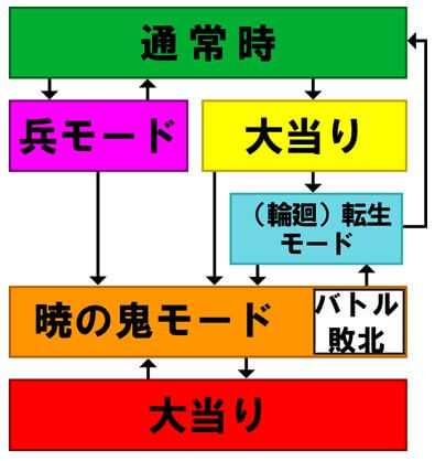 通常時に「つわもの絵柄」が停止するとモード移行が発生。小当りor潜伏確変となっており、「兵モード」はランクアップするほど内部確変の期待度が高い。