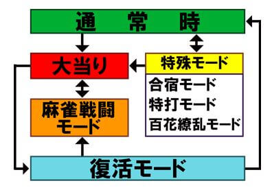 絵柄揃い時は「麻雀戦闘ボーナス」となり、必ず確変となる麻雀戦闘モードへと突入。その他は特殊絵柄停止の「嶺上開花ボーナス」「花天月地ボーナス」があり、後者のみ通常大当りの可能性がある。