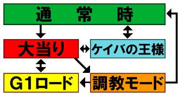 通常時から小当りor潜伏確変に当選すると「ケイバの王様」へと移行する。ケイバの王様はスタジオの色が赤ならば潜伏の期待度が高くなっている。またモードは6名の女性アシスタントの中から1人選ぶ特殊モードとなっている。