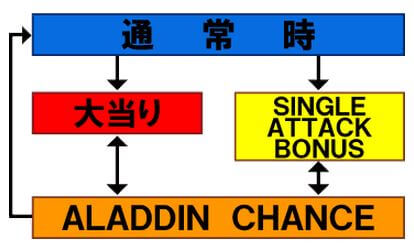 絵柄揃い大当りにはBIG BONUSとBONUSの2種類が存在。前者ならば16R確変、後者は4R確変となっており、いずれもラウンド終了後はALADDIN CHANCEに突入(継続)する。また、SUPER ALADDIN CHANCEとPREMIUM ALADDIN CHANCEが存在。いずれもラウンド終了後の保留内が激アツ必至に!?懐かしのサウンドも聞き逃し厳禁。