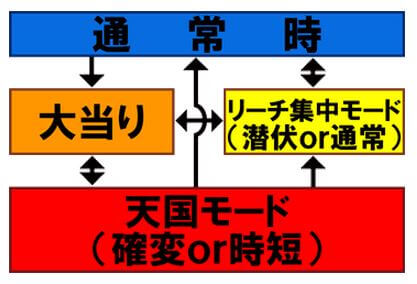 また、潜伏確変の可能性がある「リーチ集中モード」も存在。テンパイハズレもしくは、奇数揃い大当りラウンド中にパト告知非発生で突入し、リーチ発生率がアップする。