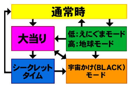 通常時から潜伏確変となるのは、モード移行発生時のみ(潜伏or小当り)。モードは「えにぐまモード」と「地球モード」の2種類存在し、後者なら潜伏確変が確定する。