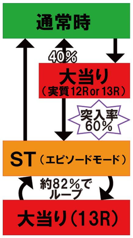 ST中は約1/60で抽選、大当りすれば再度STに突入する。計算上は約82%で継続し、この間の大当りはすべて約1510個のため、ループしてくれれば大量出玉が期待できる。