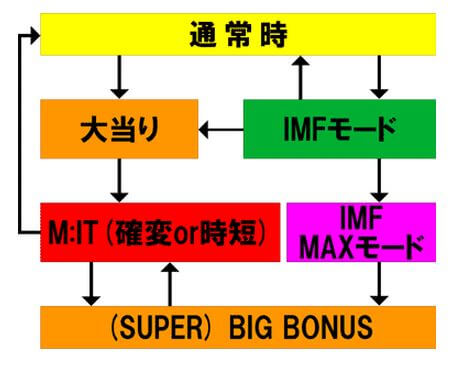 通常時から小当りor2R確変に当選するとIMFモードへと移行。IMFモード中の内部状態は通常or潜伏確変となっており、こちらはIMF MAXモードまで昇格すれば潜伏確変が確定となる。