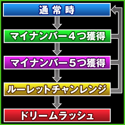 本機のゲームフローは下記の通り。ゲーム性は少し複雑に見えるが、めくるめく高継続率確変「ドリームラッシュ」へと突入させられればOKだ。プレイする前に自分で好きな大当り数字を選択することができる「ロトパチシステム」を採用しているので、プレイ前には5つの数字からマイナンバーを選択しよう。