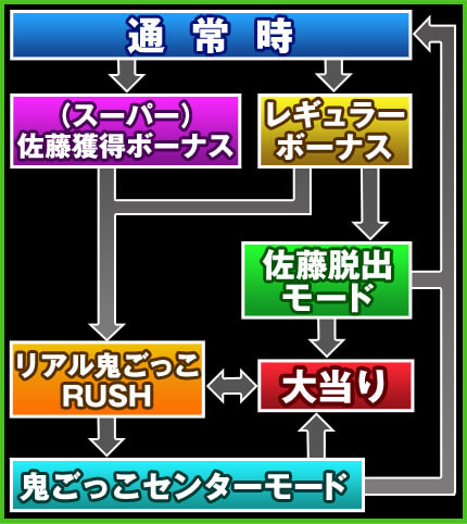 (スーパー)佐藤捕獲ボーナスはST突入。レギュラーボーナスは消化中の演出に成功でST突入、失敗時は時短100回の佐藤脱走モードに移行する。時短中に引き戻せれば、もちろんST突入となる。