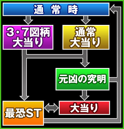 3・7図柄大当りの「超慟哭大当り」はST「最恐ST」に突入。3・7図柄以外の大当りは、ラウンド消化中の演出に成功すればST突入、失敗時は100回の時短「元凶の究明〜水沼マリエ〜」となる。時短中に引き戻せればST突入。