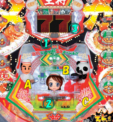 1 巨大セグ下にある「餃子の王将」と書かれた飛び込み口を狙おう。連続入賞すればVIPルートへの突入率アップ!?