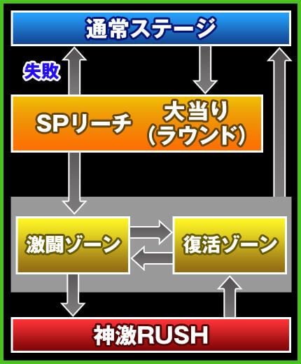 通常ステージからはSPリーチ発展で大当り!?ターゲットアタッカーを狙い、ラウンド中の演出に成功すると電サポが作動する激闘ゾーンへ、失敗すると通常ステージとなる。