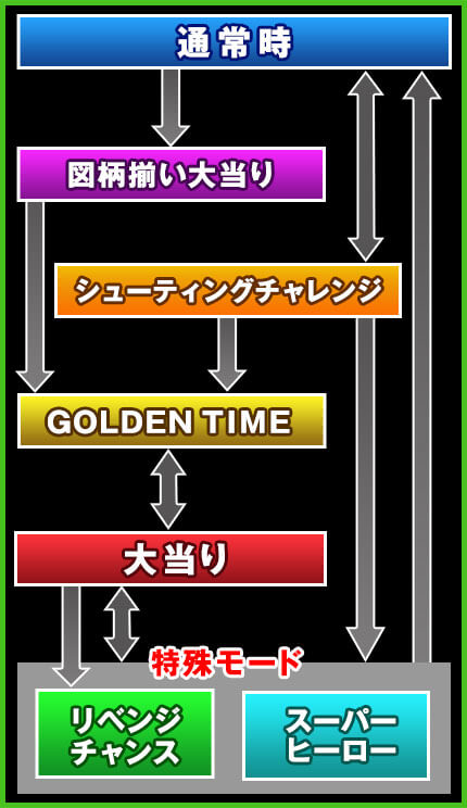 スーパーヒーロー、リベンジチャンスの2つで、どちらも確変or通常(時短100回)という状態。スーパーヒーローの方が確変期待度は高い。