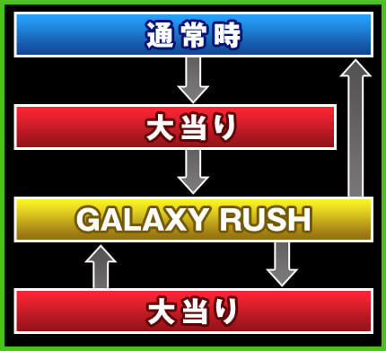通常時からの初当り後は「GALAXY RUSH」へと突入。こちらは電サポ100回継続し、内部状態はST or時短となっている。電サポ中に16R大当り当選するとラウンド終了後はSTへと突入する。