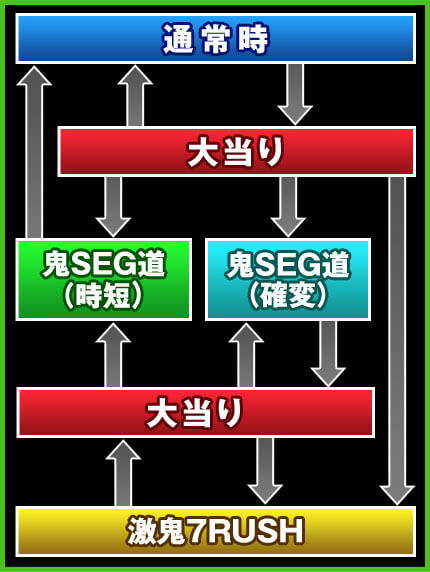 確変or時短となっており、電サポ100回を超えると超鬼SEG道突入で確変、桃子登場ならば激鬼7ラッシュ突入となる。時短だった場合は電サポ終了となり、通常へと転落する。