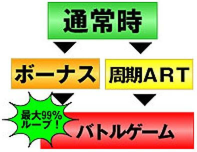 RT・ART「バトルゲーム(BG)」の最大ループ率が99%にもなる本機。ワンセットあたりの平均純増枚数は28枚程度だが、ボーナスで終了することがないためループ率99%を引いたときの平均獲得枚数は7000枚にもなるぞ。