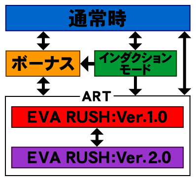 基本となるART「EVA RUSH:Ver.1.0」は1Gあたりの純増約1.6枚、1セットは30G+上乗せ分となっており、消化中はゲーム数・セット数の上乗せ抽選を行う。また、覚醒BIG(覚醒した初号機の7絵柄揃い)後や通常ARTからの昇格などで突入する「EVA RUSH:Ver.2.0(覚醒ART)」は、ベルがすべて林檎に変換され、上乗せ性能が4倍にアップする。さらに、覚醒ART中にボーナスが成立すると、ボーナス中のベルがすべて林檎に変化するので上乗せの大チャンスとなる。