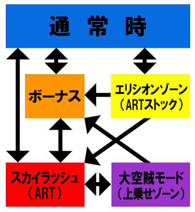 また、ARTには「スカイラッシュ」と「大空賊モード」の2種類があり、後者なら上乗せ確率大幅アップ!頻繁に成立する押し順ベルでも1/4以上の確率でストックをゲットできる仕様だ。