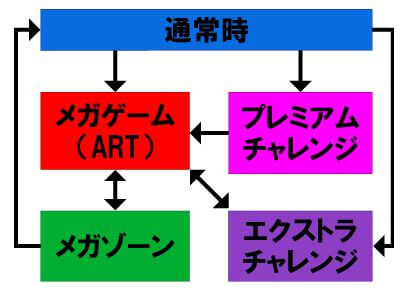 1セット100G、1Gあたりの純増約2.4枚のARTメガゲームへは、通常時の特定小役成立時の抽選や、赤V揃い(1セット以上確定)・BAR揃い(5セット以上確定)から突入する。