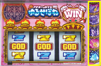 レバーON時または第1停止時に音を伴って下記画像の黄色で囲ったサイドランプが点灯。それぞれに対応役や法則などが存在する。
