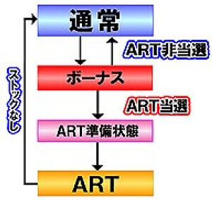 ARTをメインに出玉を増やすタイプ。主にBIG中の7揃いから突入し、ストックがあれば消化後に一旦「ART準備状態」へ移行。そこで2択提灯を取りこぼすと発動する仕組みだ。