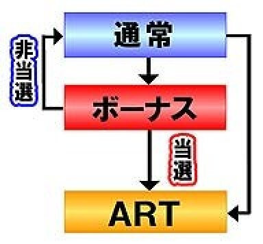 ART中のナビを無視した場合はAT状態(※)に転落してしまう可能性アリ。 ※AT状態=リプレイ確率が通常ゲーム時と同等で、3択ベルの押し順ナビのみ発生