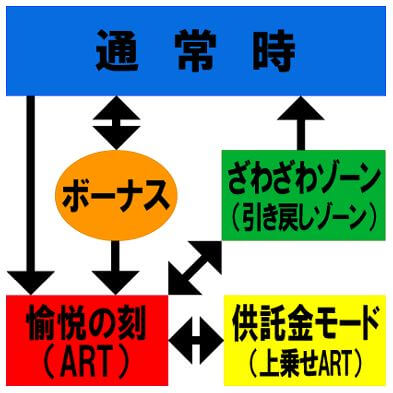 基本ARTにあたる「愉悦の刻」中は、ハズレを含む全役成立時に上乗せ特化型ART「供託金モード」への突入抽選が行われており、契機役別の大まかな当選期待度は以下の通りとなる。