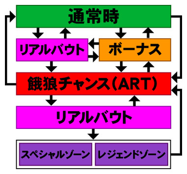 通常時に特定小役が成立すると「リアルバウト」突入抽選を行う。リアルバウトは小役のヒキが勝敗を左右するバトルとなっており、勝利すれば「餓狼チャンス」(ART)に突入する。また、ART中の特定小役成立時にリアルバウト突入抽選を行なっており、このバトルに勝利すれば上乗せ特化ゾーンであるスペシャルゾーンorレジェンドゾーンに突入する。また、特定小役成立時に直乗せ抽選も行っているぞ。
