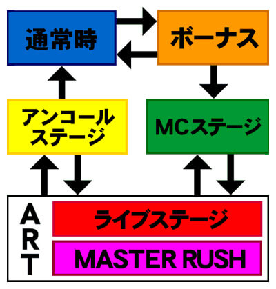 なお、上乗せ特化ゾーン「MASTER RUSH」を搭載。この間はBAR揃い(ストック確定)確率が約1/1.5となっており、一度突入すれば平均13セットの上乗せが期待できる。