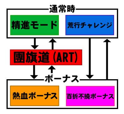 「熱血ボーナス」中は7揃いで1G連が確定するうえに、特定小役成立時などにART「團旗道(だんきロード)」の抽選も行う。「百折不撓ボーナス」中はバトルに勝利すればART確定だ。