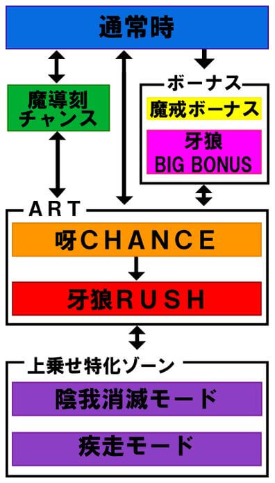 ART初当り時は、基本的に呀CHANCEに突入する。呀CHANCE中は、ハズレ、特定小役成立で牙狼RUSHの抽選が行われ、ラスト15Gから始まる呀バトルで負けなければ牙狼RUSHに突入。