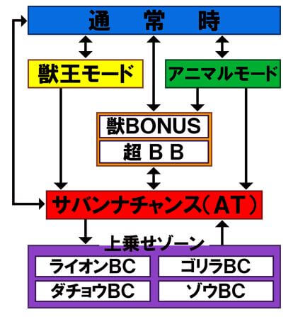 上乗せゾーンは4種類存在。AT中に獣玉を10個獲得するとビーストチャンスを経由し、上記いずれかの上乗せゾーンに突入する(詳細は各項目参照)。
