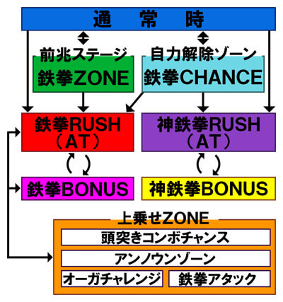 約500Gまでは自力CZと前兆ステージでAT当選を狙うオーソドックスな仕様となっており、約501G以降はデビルバトルとロングフリーズにより、プレミアムATである「神鉄拳ラッシュ」を狙う仕様となっている。