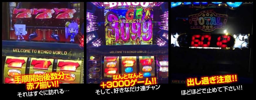 BINGO揃い時にゲートが閉じて「硬直」出現はアツイ。次ゲームのレバーで7揃いリプレイ(約1/2.8)を成立させられれば、フリーズまたは2択チャレンジが確定。