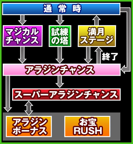 通常時の特定役成立時の一部で突入する自力CZ。1セット10G(最低2セット継続)で、毎ゲーム全小役でAC(アラジンチャンス)抽選を行っている。